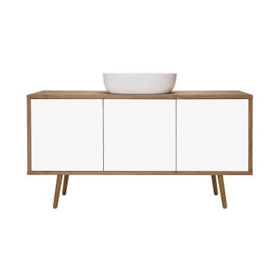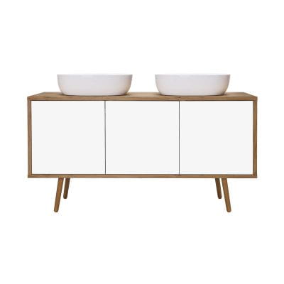 Szafka z płyty z powłoką lakierowaną na biało, odporną na promieniowanie UV oraz płyty laminowanej kolor dąb.