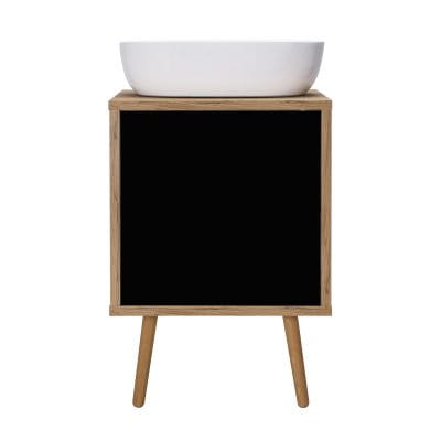 Szafka z płyty z powłoką lakierowaną na czarny mat, odporną na promieniowanie UV oraz płyty laminowanej kolor dąb. Z możliwością dopasowania nóżek, pełniących funkcję dekoracyjną (sprzedawane oddzielnie, wysokość z nogami 74 cm).
