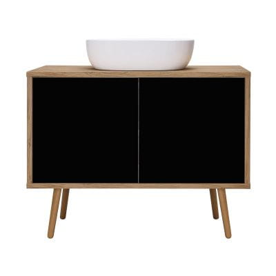 Szafka z płyty z powłoką lakierowaną na czarny mat, odporną na promieniowanie UV oraz płyty laminowanej kolor dąb.