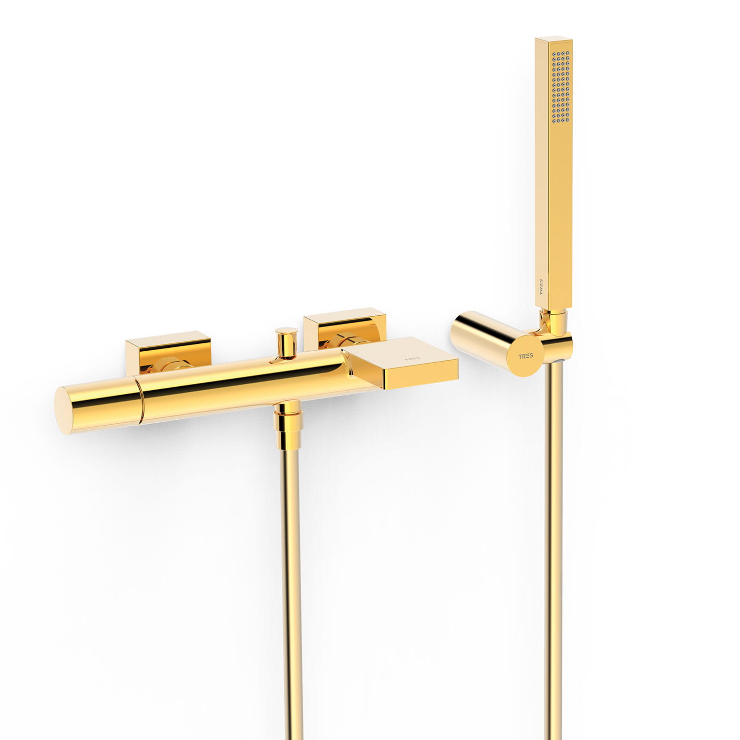 Bateria jednouchwytowa w kolorze złotym od marki Tres z serii Project przeznaczona do wanny. Produkt dedykowany jest do montażu ściennego. Słuchawka antical z obrotowym statywem.
